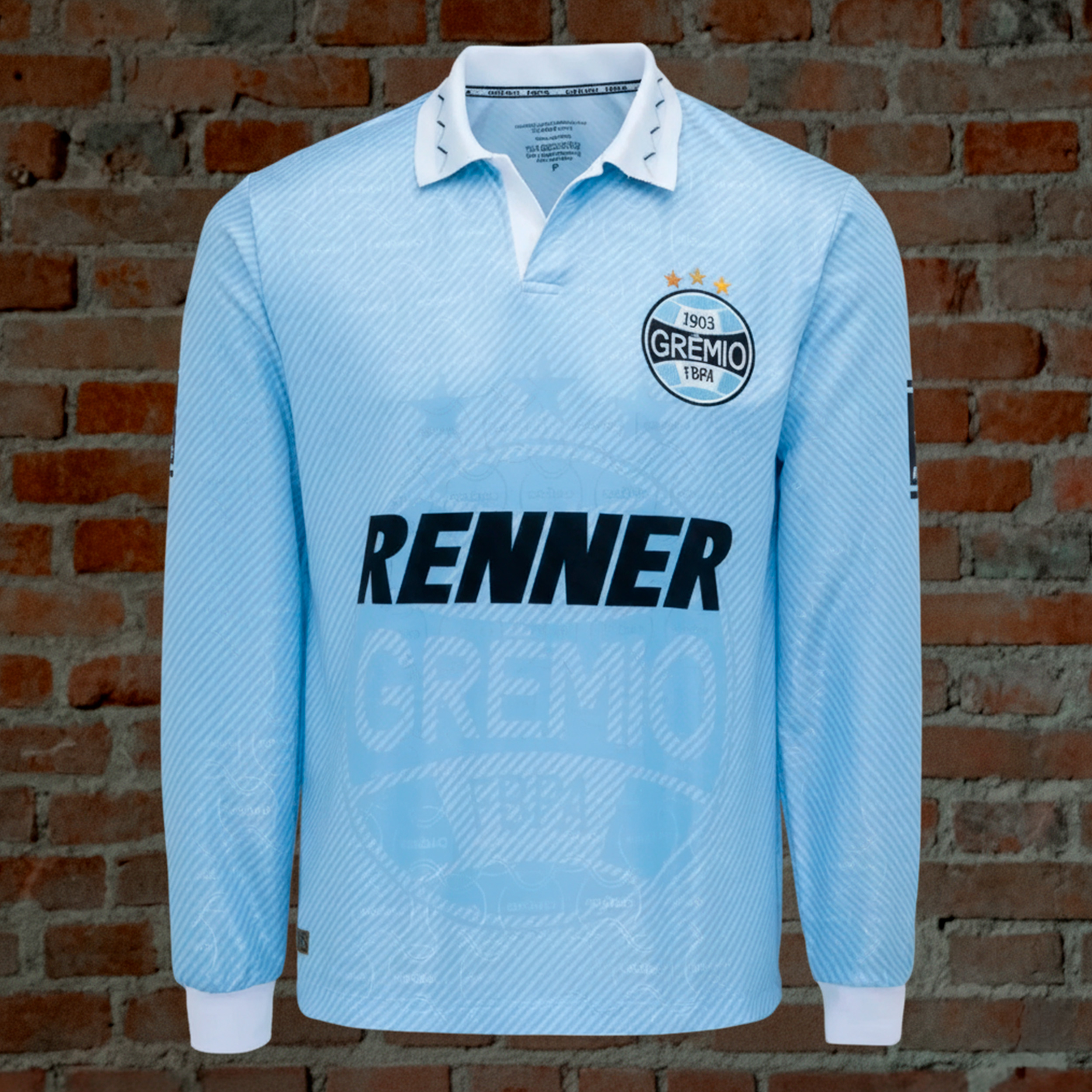 Esta peça resgata com fidelidade o design clássico que marcou a era de ouro do Grêmio. O tom celeste — tradicional nas cores do clube — representa elegância, história e orgulho de vestir um dos mantos mais icônicos dos anos 90.